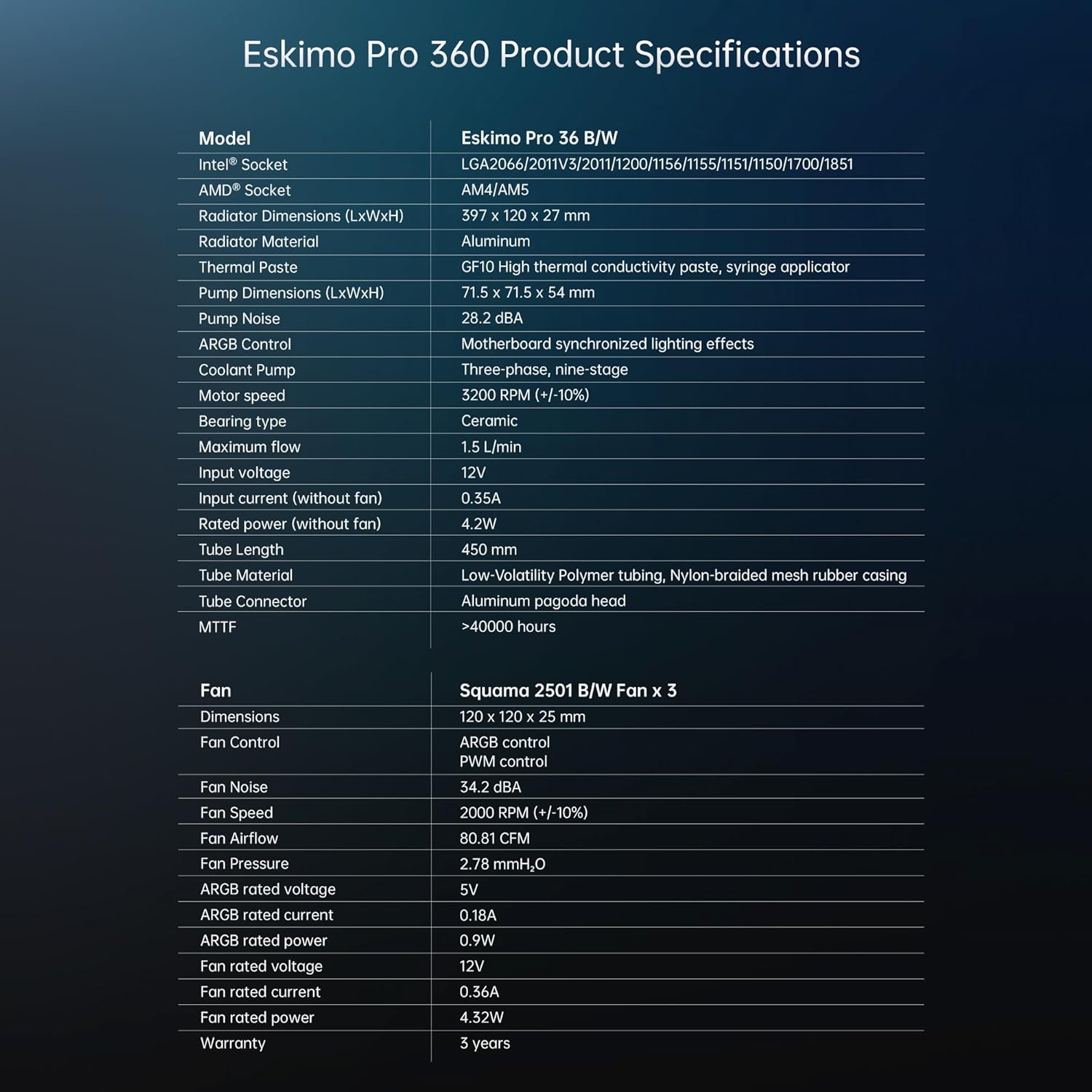 Eskimo Pro - 420mm AIO CPU Liquid Water Cooler- RGB PWM Squama 2503W 140mm Fan x 3- Fit Intel® LGA 1700, AMD®AM5 - White- (GEO-EP-42W)
