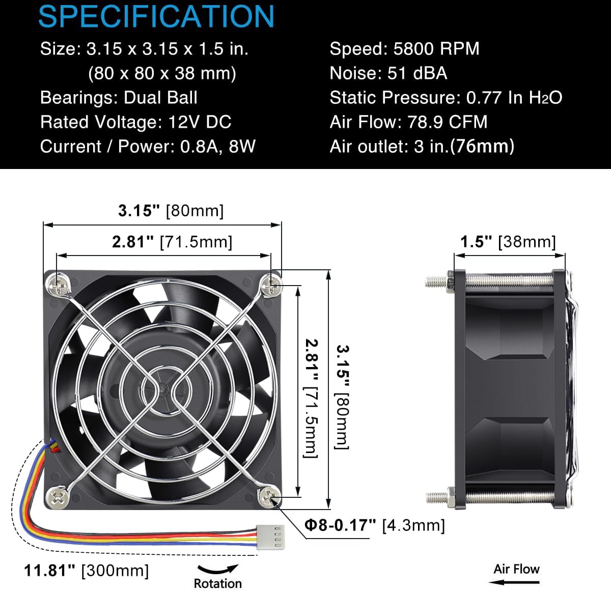 • 【DC AXIAL FAN】80x80x38 mm (3.15x3.15x1.5 in.) , Rated Voltage: 12V DC , Current: 0.8A , Power: 8W , Speed: 5800 RPM , Noise: 51dBA , Airflow: 78.9 CFM , Static Pressure: 0.77 In H2O