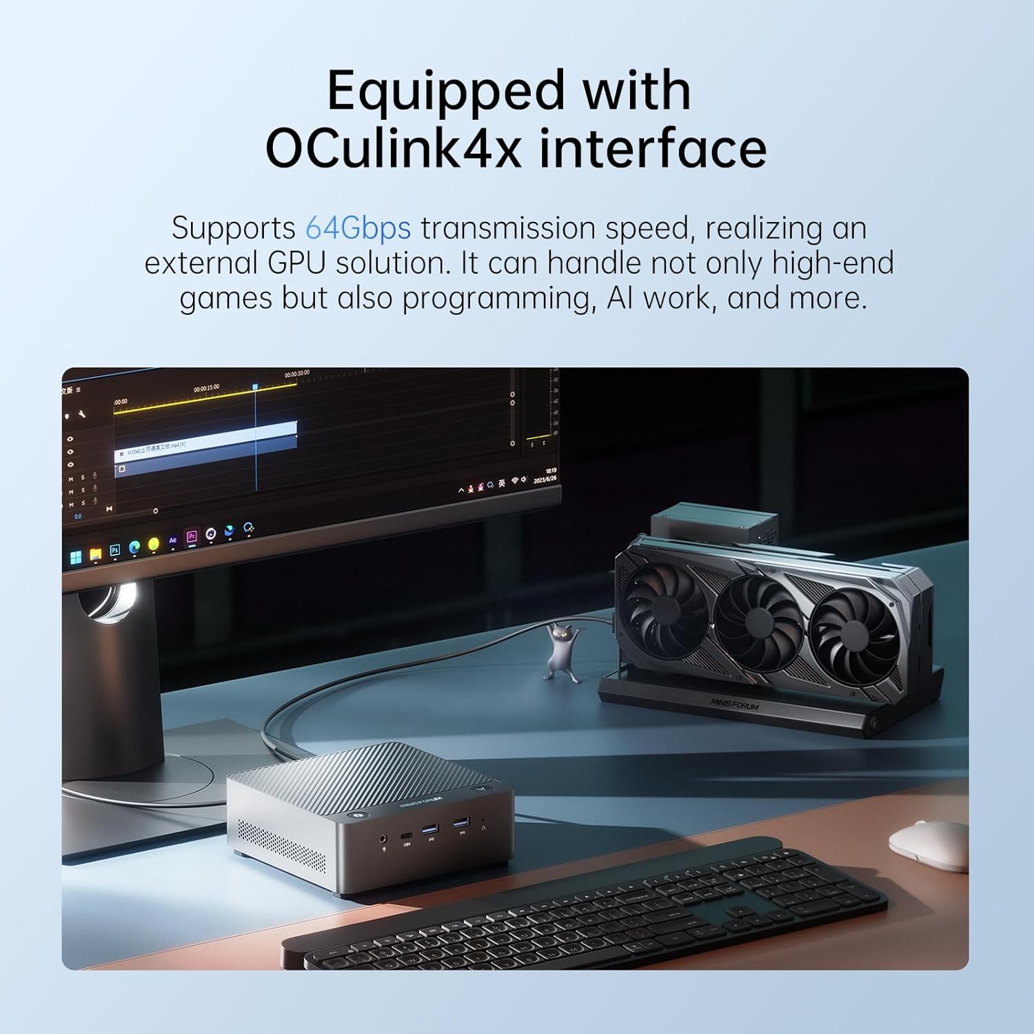 • 【Various Peripheral Interfaces】Including 2 x 45.2G RJ5 Ethernet ports, 1 x Oculink port, 4 x USB3.2 Gen2 Type-A ports, 2 x USB4 ports (supports Alt PD, 65-100W PD input, 15W PD output), 1 × HDMI 2.1, 1 × DP 1.4, 1 × audio jack, 1 × DMIC, 1 × Clear CMOS button, providing comprehensive connection options to meet various peripheral needs.