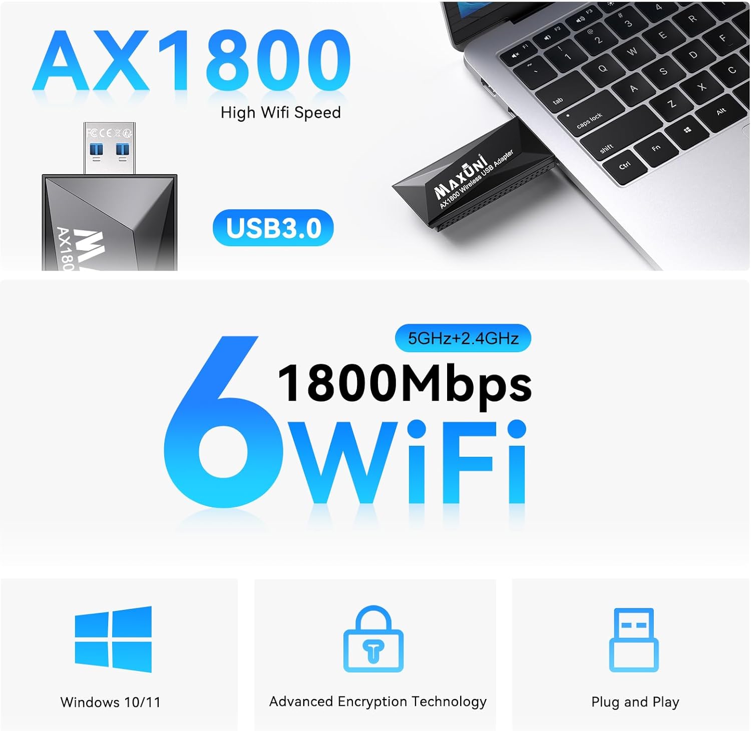 AX1800 USB WiFi Adapter for PC, Wireless Network Adapter for Desktop with 2.4G/5G, WiFi Dongle, USB 3.0, Supports Windows 11/10, AX1800Mbps, Plug and Play, with Driver, Maxuni