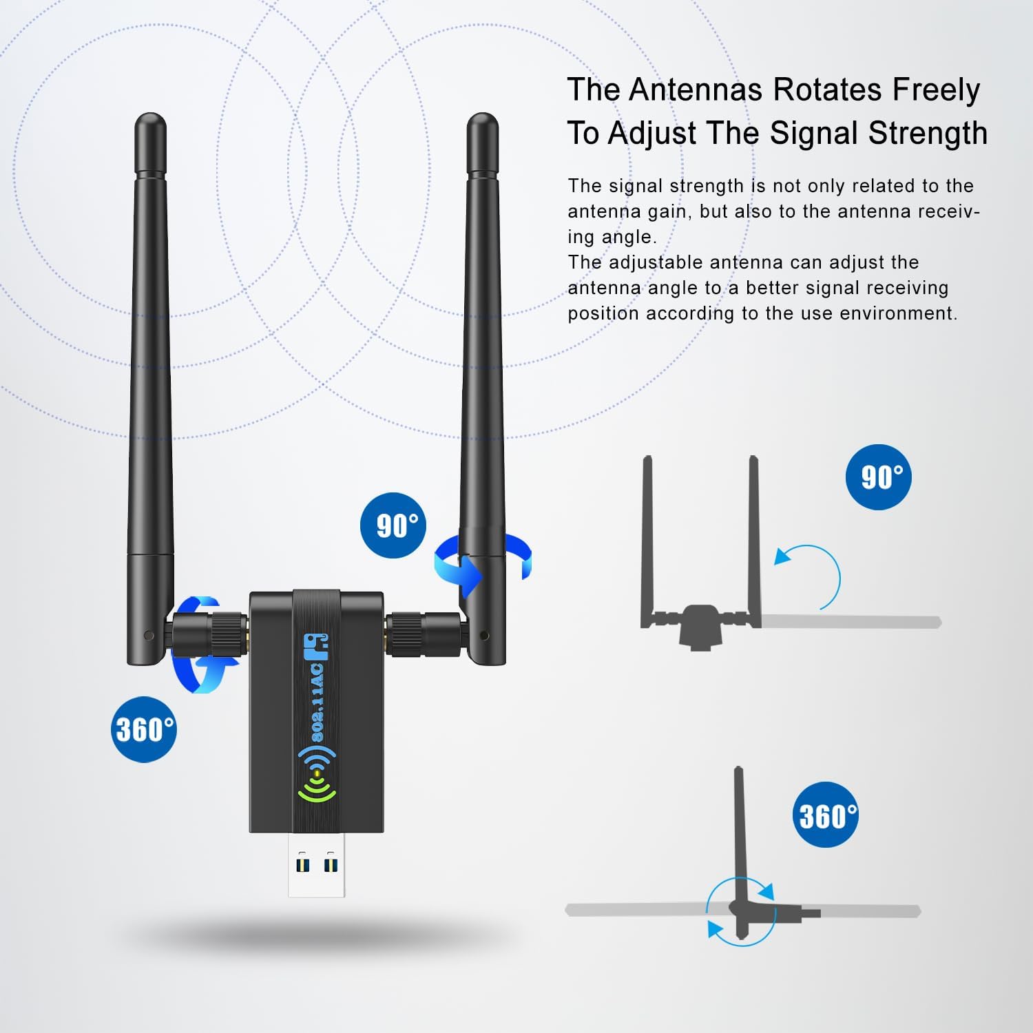 • Dual High Gain WiFi Antennas - Equipped with two 5dBi high-gain antennas, this WiFi Adapter for PC ensures enhanced signal reception and transmission. The 180° rotatable design enables optimized signal strength from any direction.