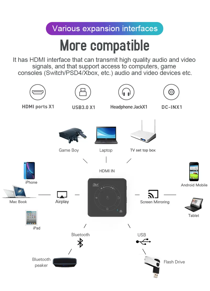 ,● Built in Li-ion Battery: 3000mAh● Works for 1 hour after fully charged,also can charge for smartphone,also work with 5V 3A Power bank● Video Support(up to 4k):VP9-10,H.265,H.264,MPEG-4,WMV/VC-1,MPEG-2,MPEG-1,RealVideo 8/9/10 etc.● Audio:Support:MP3,WMA,MP2,OGG,AAC,M4A,MA4,FLAC,APE,3GP,WAV● Image :Supports variety of image formats browsing (jpg, png, bmp etc.)● Extended Storage:Support TF Card and Hard Disk● Remote Control:Support(IR) Infrared and 2.4G wireless control● Built-in speaker:1*1W● Light machine Consumption: 3W● Whole Power Consumption: 5W● Power : AC100-240V,50/60Hz DC 5V 3A