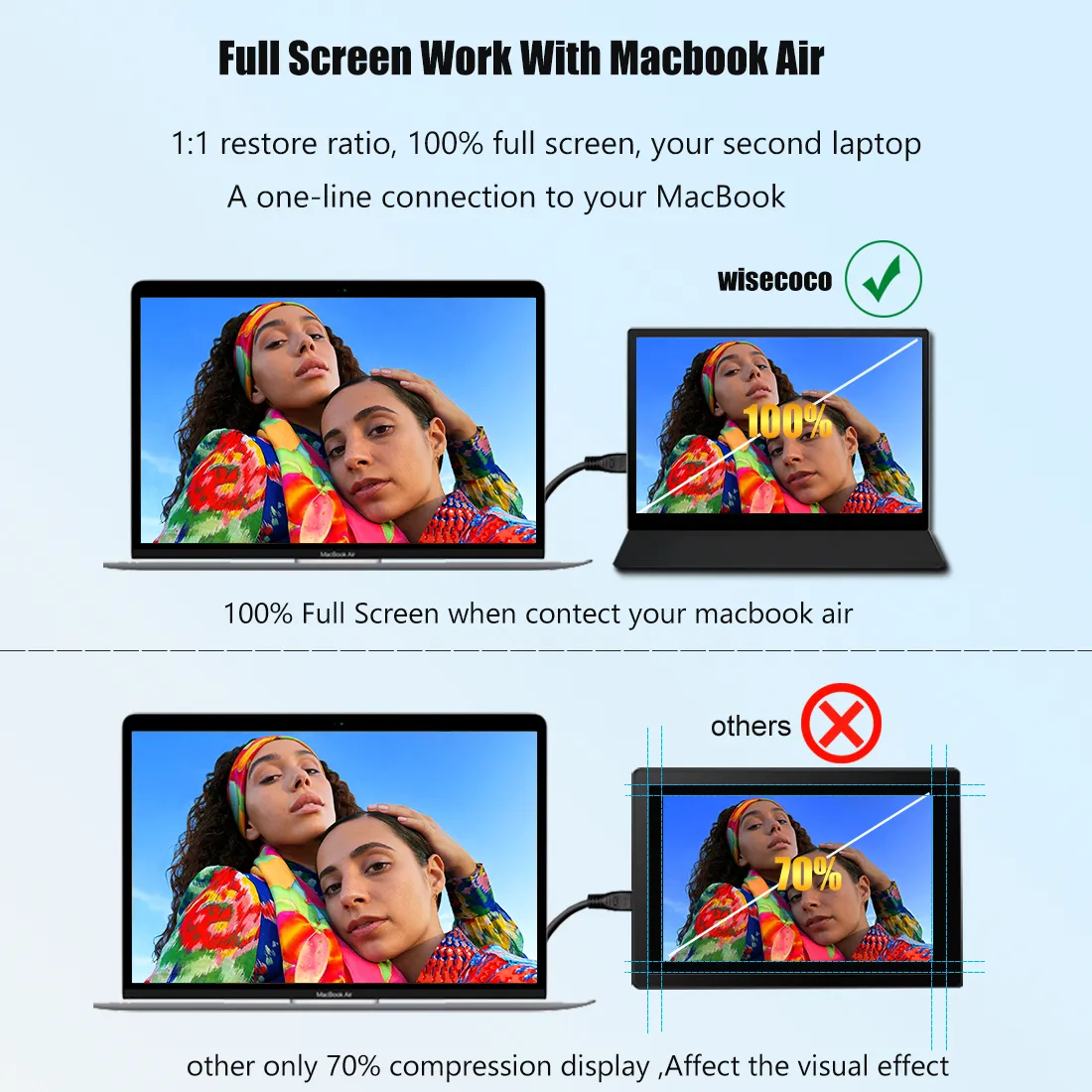 Perfect with macbook air--- Wisecoco 8.9 inch portable monitor for macbook, The same 2560*1660 high resolution as the macbook, no need to adjust when connecting your macbook, 1:1 restore ratio, 100% full screen, enjoy a visual feast