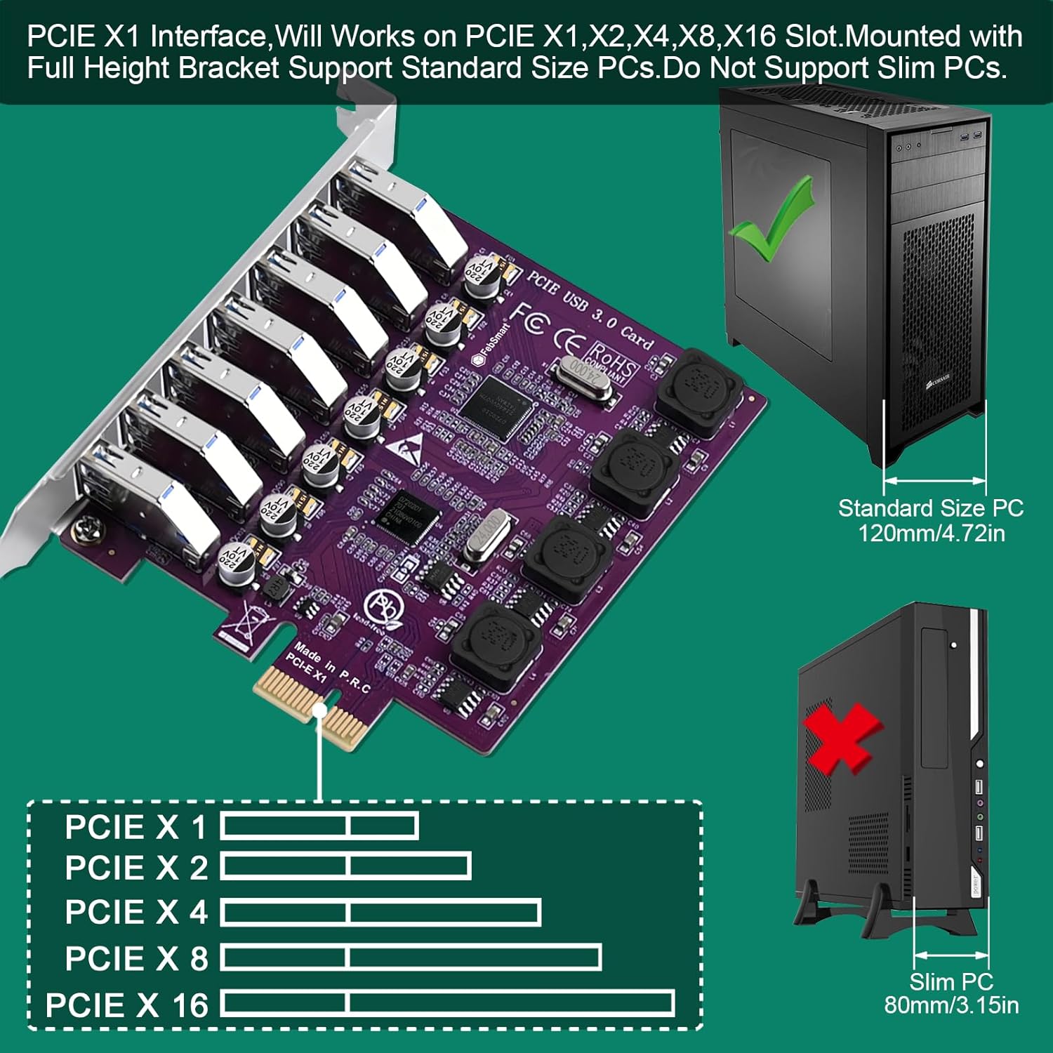 • 5. PCIE X1 interface design, will works on PCIE X1, X2, X4, X8, X16 slot, do not work on PCI slot. Based on PCIE 2.0 standard, will compatible with PCIE 1.x, 2.x, 3.x, 4.x PCIE slot. The full height bracket mounted on this PCIE USB 3.0 expansion card, will works on Standard Size PCs. Not support low profile bracket, do not work on Slim PCs.