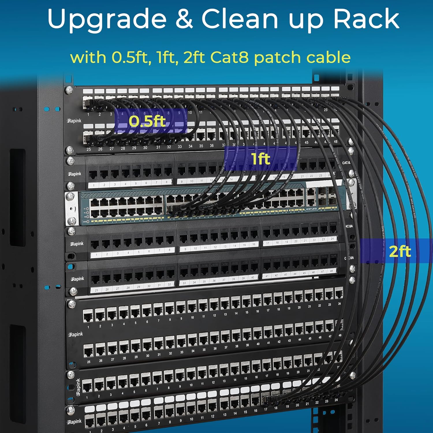 • 【Upgrade and Clean Up Rack】Good size 1ft patch cable for clean wire management install. Short ethernet cable make your setup so much easier and cleaner with all same length and color. Cable patch cords is more reliable and secure than Cat6 cable network. Great for Tight Racks with very little space between the equipment. Meanwhile, CAT 8 rated cable are future forward compatible for future possible upgrade to 40G Speed.
