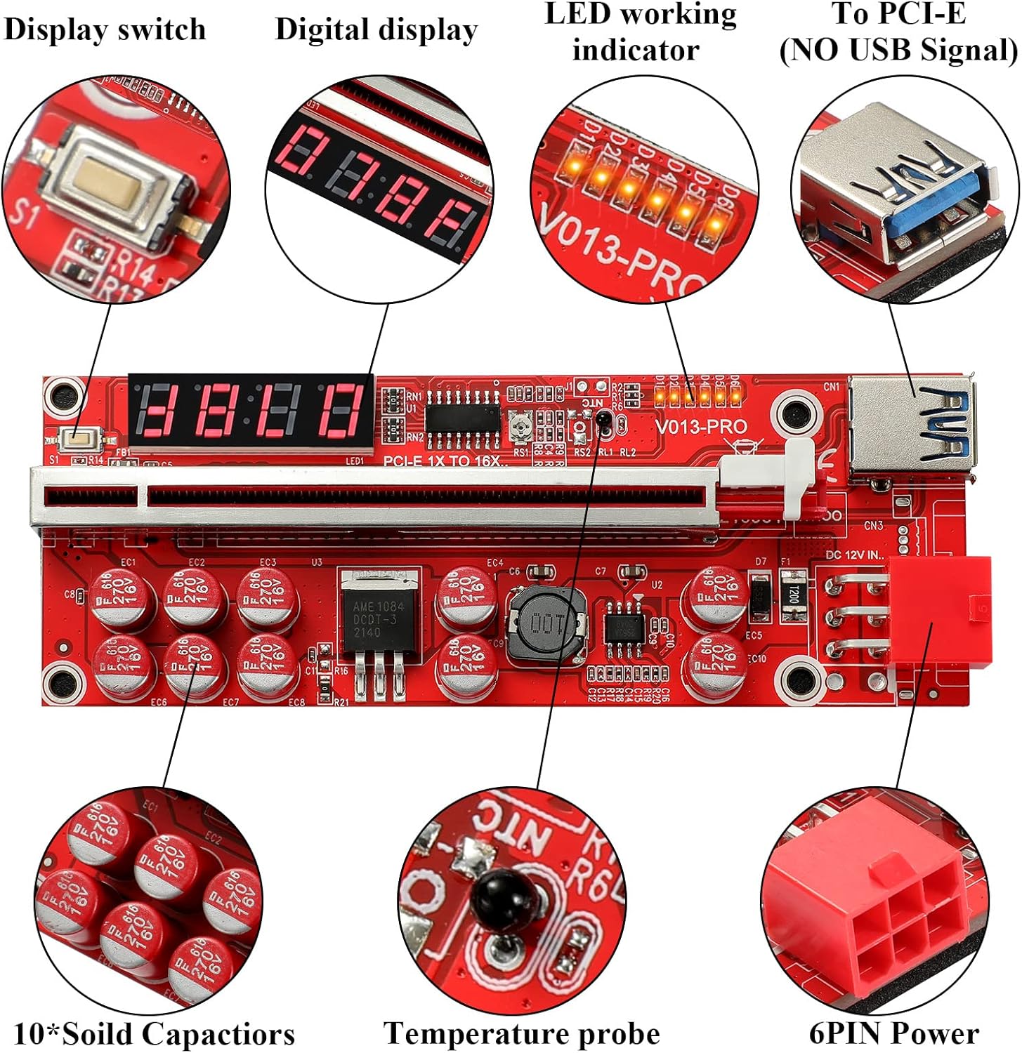 PCI-E 1X to 16X Riser Card, 10 Capacitors,PCI-E Riser for Bitcoin Litecoin Ethereum Mining ETH,with USB 3.0 Extension Cable, 6PIN SATA Power Cable - GPU Extender Riser Card - (V013-PRO,6 Pack)