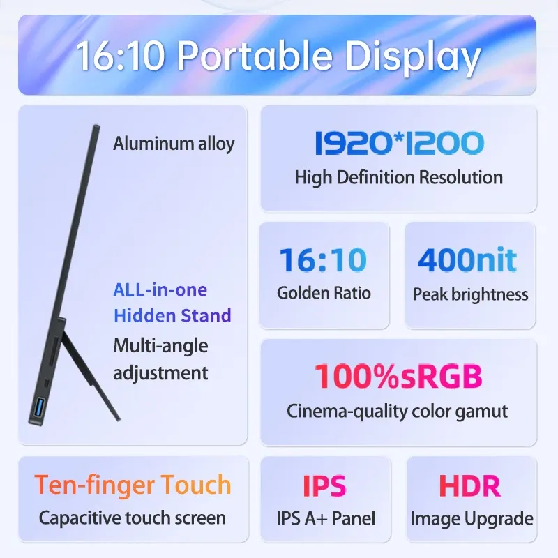 16inch Portable Monitor 1920*1200P Touch Screen 100% SRGB Gaming Computer Display for Steam Deck Laptop Switch PS4 PS5 Xbox