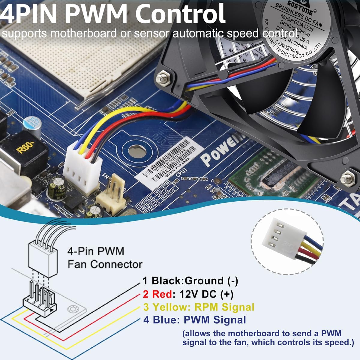 • 【PWM FUNCTION】The fan uses 4-pin interface, with speed regulation (blue wire), speed measurement functions (yellow wire); run at full speed if just red and black wires