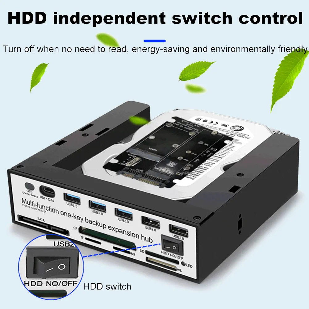 5.25inch Multi-Function Expansion Hub 3*USB3.0 2*USB2.0 1*USB-C Optical Drive Extension Panel External Hard Disk Drive Hub with SATA 5Gbps One-Key Backup for 2.5& 3.5 SATA Hard Disk/M.2 NGFF/Msata SSD Feature: 1. Multi-interface Expansion: This PC front panel USB hub offers various interfaces and functions, allowing you to expand mechanical hard drives (HDD) and M.2 NGFF/mSATA SSD solid-state drives in the 5.25" drive bay. Users can conveniently use different types of hard drives on the same device, making data storage and management easier. 2. Front Panel Design: This multi-function expansion hub features a front panel design, allowing users to directly insert and remove hard drives from the computer`s front panel, saving installation and connection time. Users can easily insert, replace, and operate hard drives, enhancing their availability and usability. 3. Multiple Interface Support: This hdd docking station supports multiple interfaces, including SATA, M.2 NGFF, and mSATA interfaces. It is compatible with various hard drive specifications and types, catering to different user needs. This enables users to freely choose and combine hard drives of different specifications to meet storage and performance requirements. 4. Hard Drive Expansion and Data Transfer: This external hard disk drive not only provides hard drive expansion capabilities but also supports high-speed data transfer. By utilizing the SATA interface, users can achieve fast data transfer and efficient read/write speeds, improving the performance and productivity of the hard drive. This is particularly important for users who require high-capacity storage and fast data access. 5. Suitable for Various Scenarios: This hard drive hub is suitable for various scenarios, including personal computers, office computers, and servers. It can be used to expand hard drive space and functionality, providing flexible storage solutions to meet different user needs and application scenarios. Specification: Origin: Mainland China Interface Type: USB 3.0 Ports: 6 Standard: USB 3.0 Funtion: None Package: Yes 3*USB3.0_AF interface, data transfer rate 5Gbps 2*USB2.0_AF interface, data transfer rate 480Mbps 1*USB-C (Type C) 3.0 interface, data transfer rate 5Gbps Built-in SATA: Support 2.5-inch and 3.5-inch SATAI/II/III HDD and M.2 B key NGFF(For 2230/2242/2260/2280mm)/Msata SSD SSD (No HDD, No Memory Capacity) (PCIE protocol Nvme SSD not supported) OTB one-click backup: easily and quickly transfer files from PC to HDD SSD/HDD HDD switch: control the built-in SATA HDD on and off Support card reader M2/TF/SD/MMC/MS/CF LED card reader read/write status indicator External SATA: Provide power and data transmission All-in-one cable, connecting cable: 1*20PIN cable, 1*SATA cable, 1*USB2.0 cable, 1*4PIN power cable, M.2/Msata SSD adapter card Product size: 148.00x140.00x41.00mm Product Size: 5.83x5.51x1.61in ch Note: 1 x PC Front Panel USB Hub |