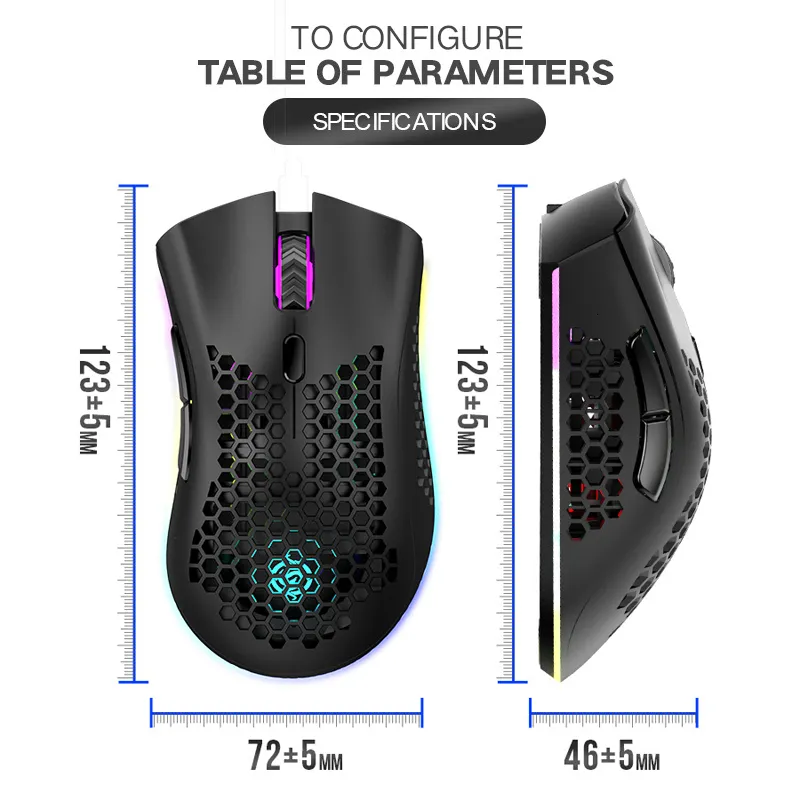 Lightweight Gaming Mouse: The mouse adopts a unique hollow honeycomb design, which makes the mouse more portable. The unique design refreshes your desktop.