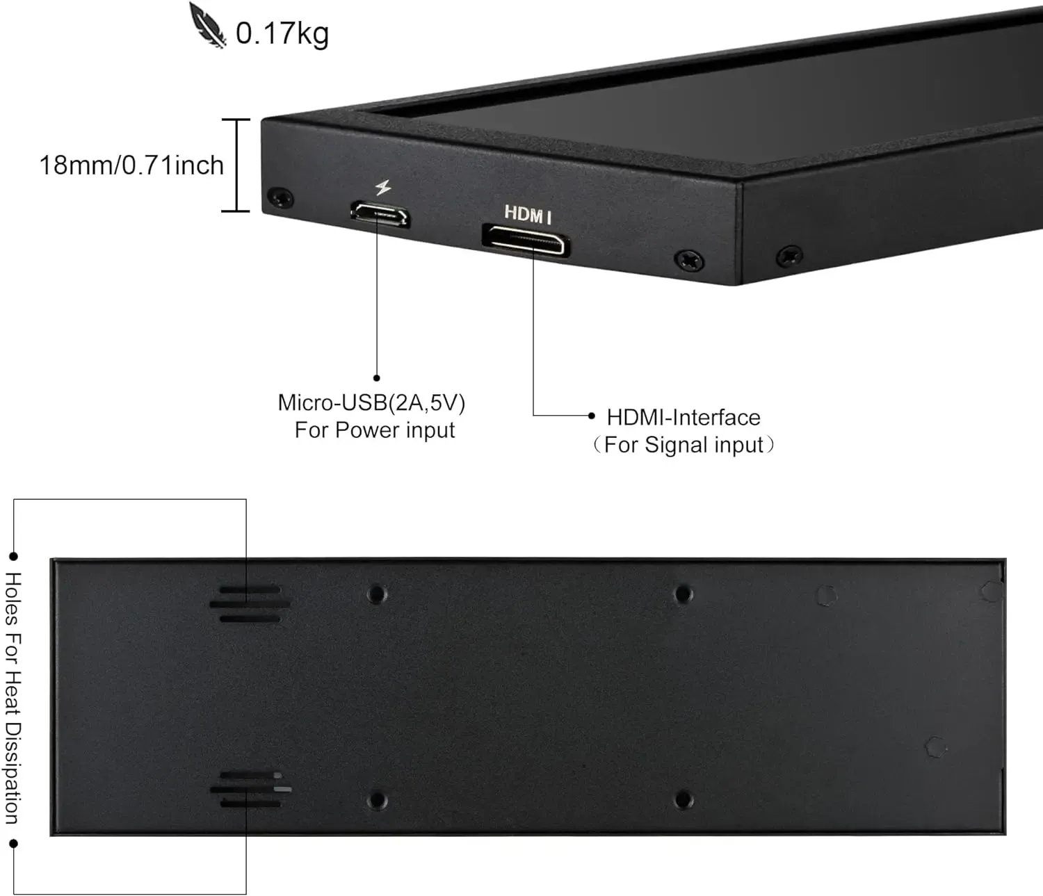 2. Plug & play, easy to use: This is a drive free display monitor. 1x mini HDMI-comaptible and 1x micro USB ports. HDMI-compatible supports data and signal transmission, one USB for power supply and touch.