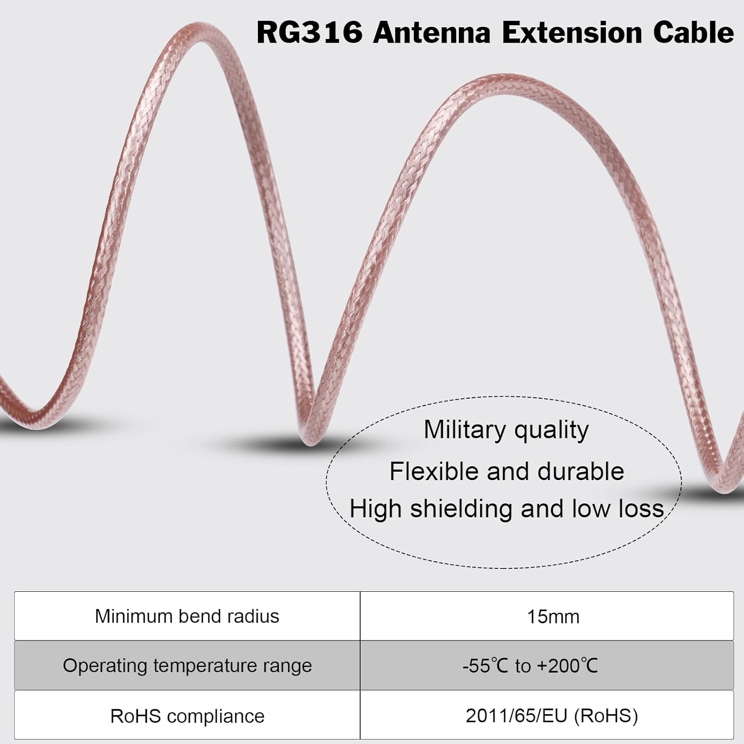 • - RP-SMA Female Bulkhead Mount 50 Ohm Connector and RP-SMA Male Right Angle 50 Ohm Connector, along with RG316 Coaxial Cable for maximum durability and reliable performance.