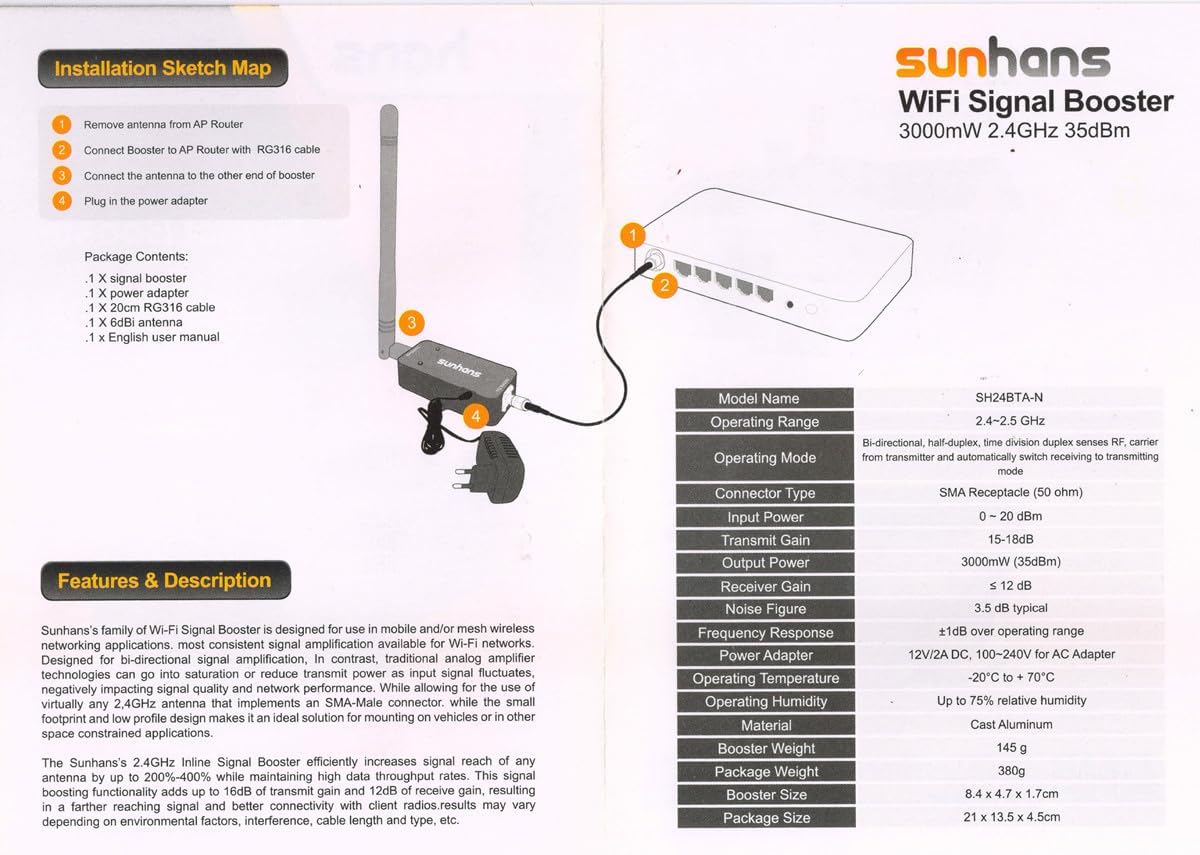 • Sunhans SH24BTA-N WiFi Booster is an indoor solution 3000mW (35dBm) bi-direction Booster designed for 2.4GHz IEEE 802.11b/g/n wireless LANs. Transmit gain: 15 - 18dB, Receiver gain: ≤12dB, This unit comes with an easy plug-and-play installation