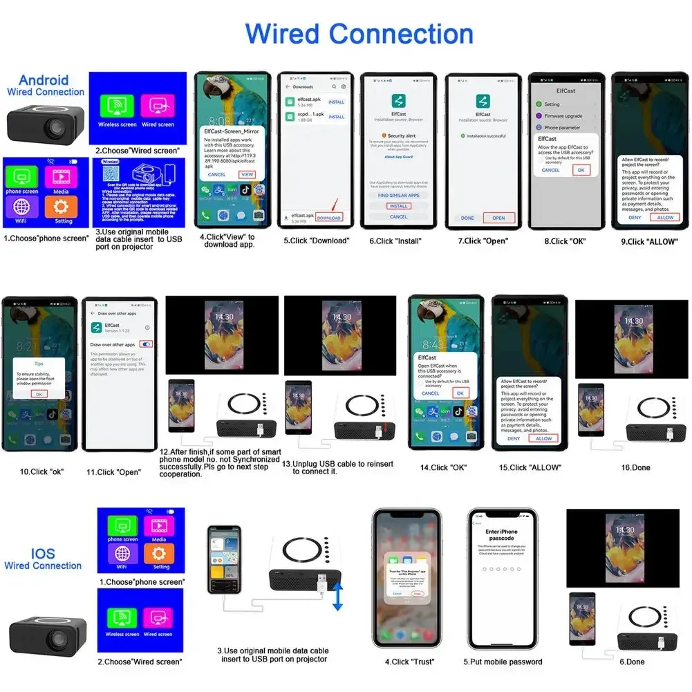 Wired connection: Directly connected to the smartphone through the original data cable;