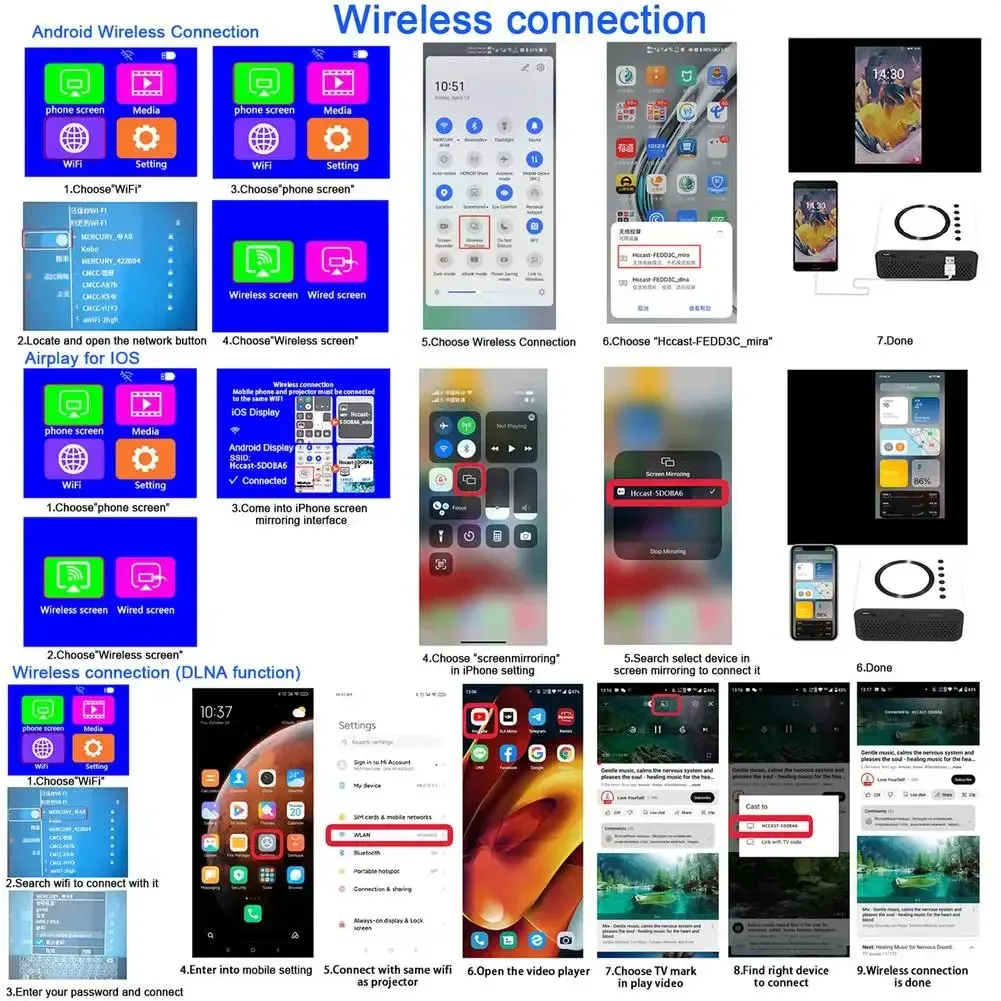 Small size, large screen: 16-100inches adjustable screen size, projection distance 0.5 to 4 meters;