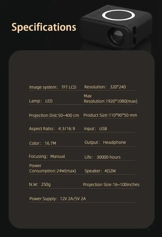 Projector size: 110x90x50mm, net weight 250g;