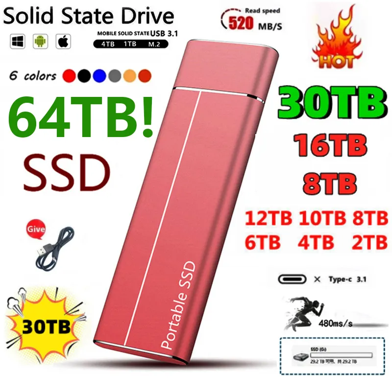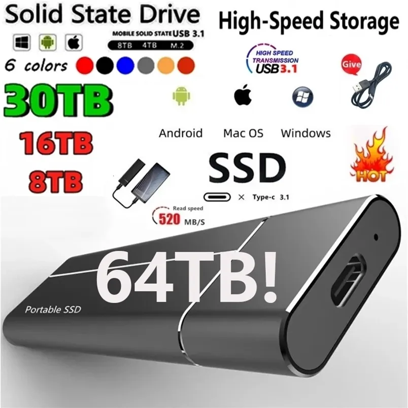 SSD High Speed Mobile Solid State Drive 64TB 30TB 25TB 20TB 16TB Type-C USB 3.1 Portable External Storage Flash Memory Hard Disk