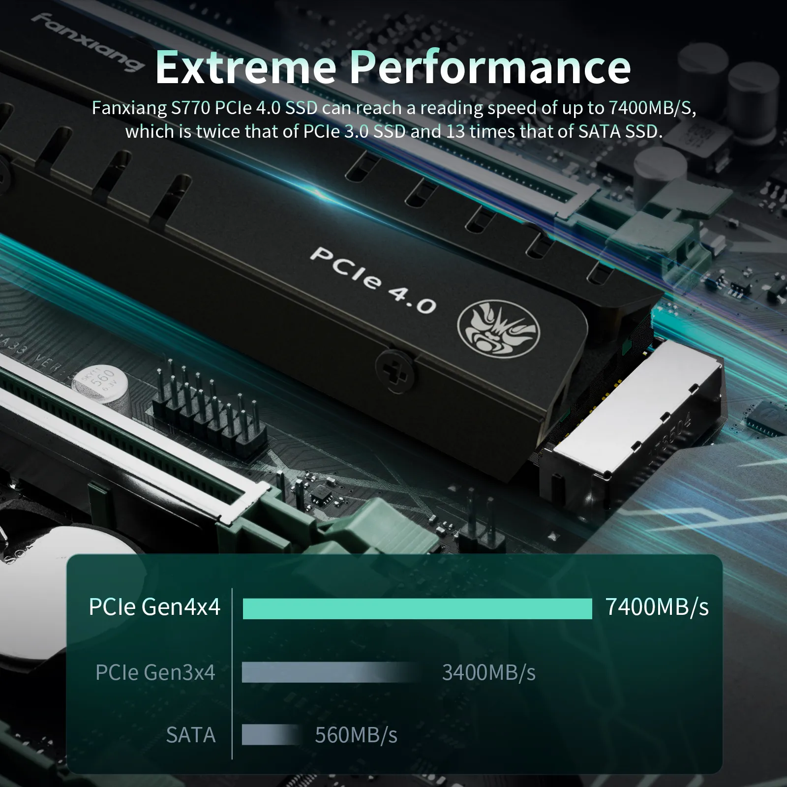 The S770 M.2 SSD utilizes cutting-edge PCIe 4.0 technology, with read and write speeds reaching up to 7400/6800MB/s,significantly reducing file transfer and game load times, providing a smoother user experience.