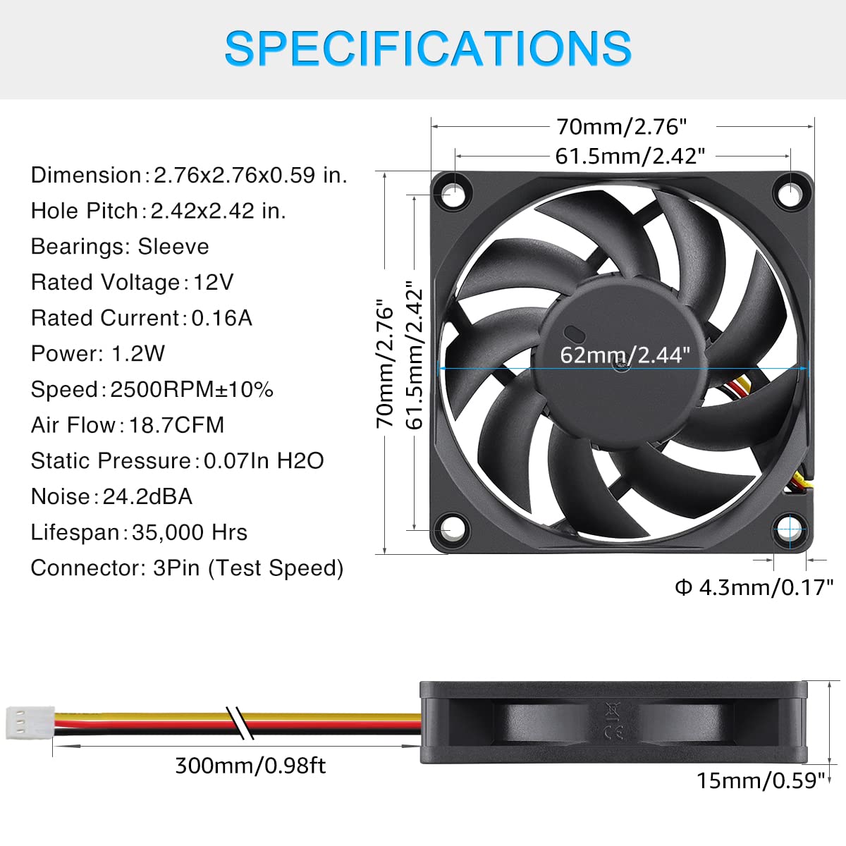 • Rated Voltage: DC 12V; Rated Current: 0.16 Amp; Rated Speed: 3000 RPM; Air flow: 35.6CFM; Noise: 31dBA