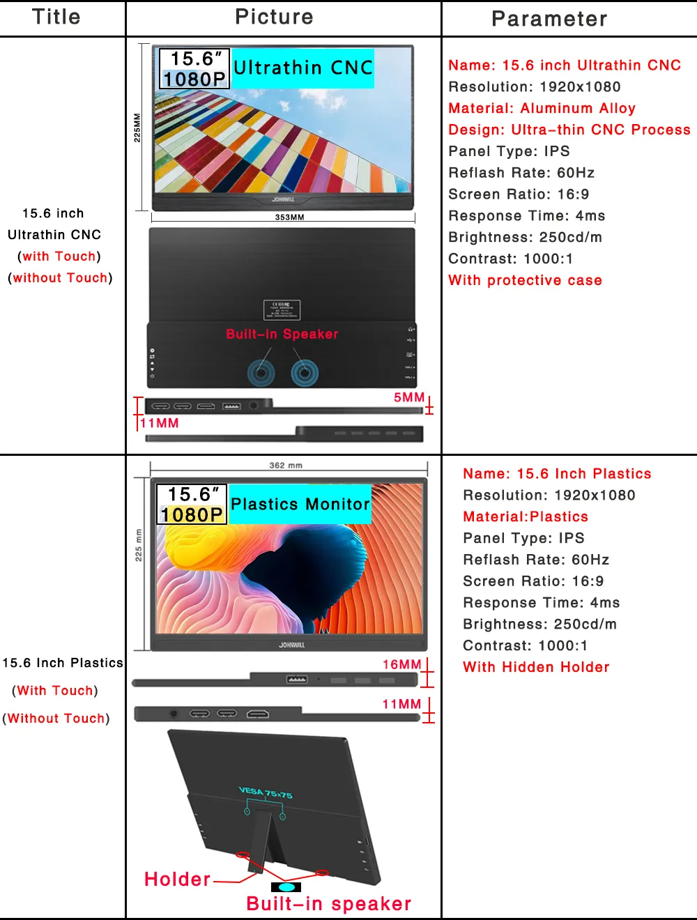 Name:15.6 inch Plastics monitor is touch monitor or without touch monitor