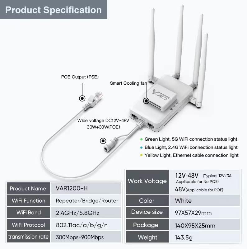 • 【Standard WiFi Parameters】Dual-band wireless bridge Added router function to receive and re-signal, fast WiFi transmission rate: 300Mbps (2.4GHz) 900Mbps (5GHz), supports 802.11A/B/G/N/AC and other network protocols, 2.4G has strong anti-interference capability, 5G can greatly improve the transmission rate and distance