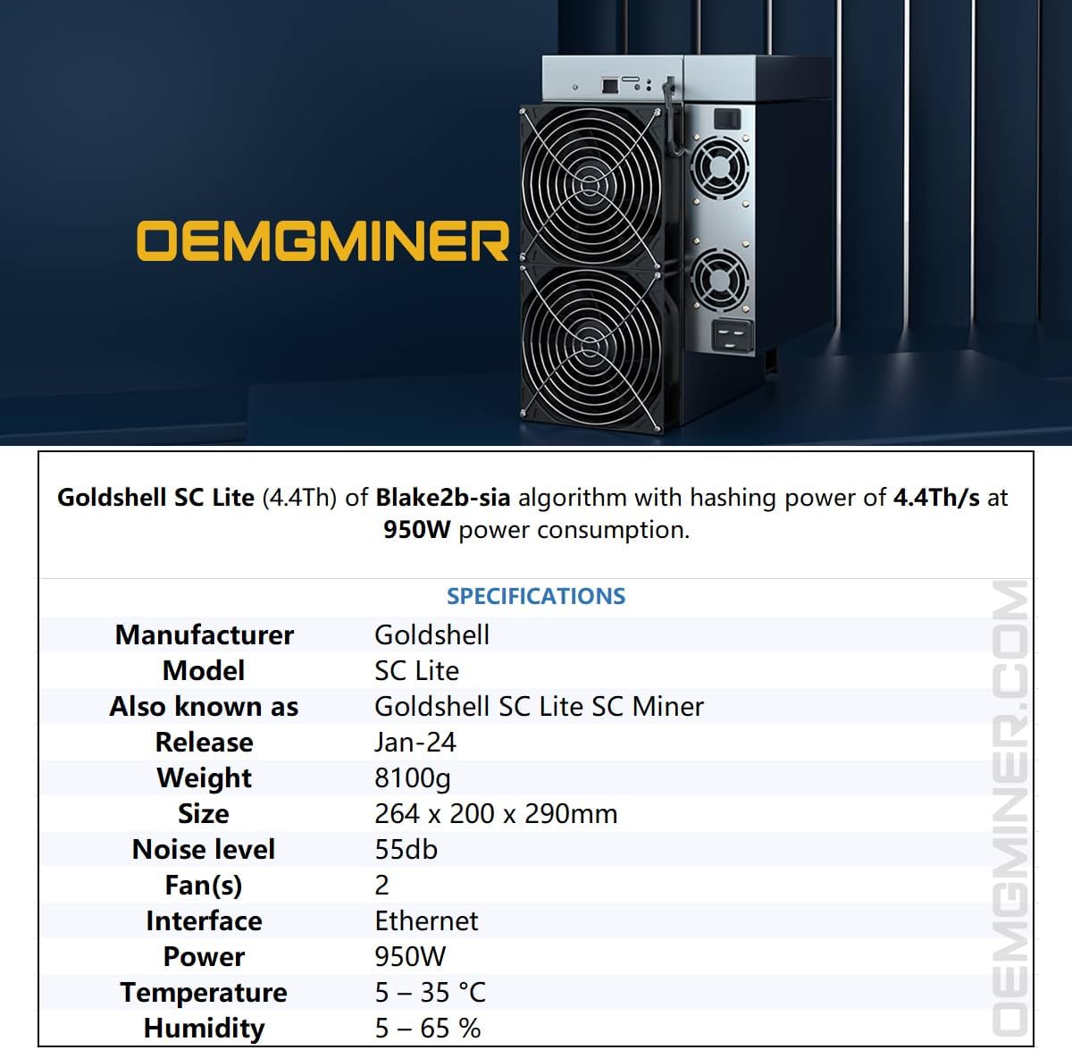 Goldshell SC Lite 4.4TH/s 950W Siacoin Miner Crypto Mining Machine
