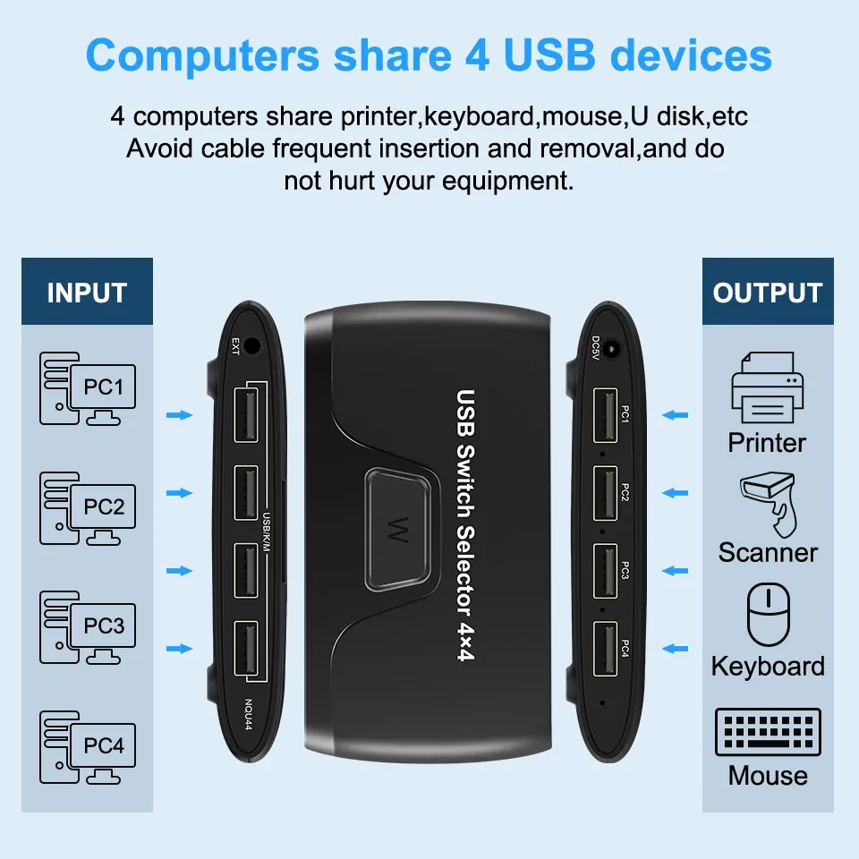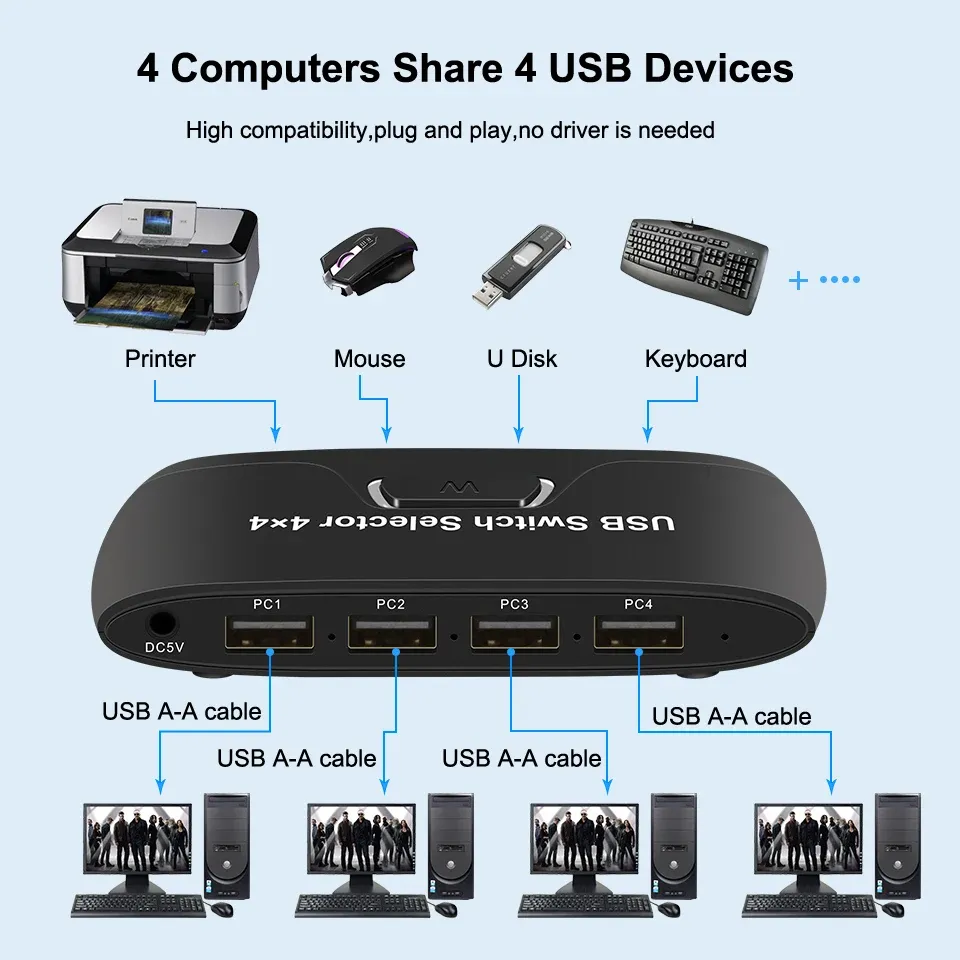 USB 2.0 KVM Switch 4-to-4 is an excellent choice to share 4 USB devices between two systems, It`s ideal for sharing a printer or scanner in a small office environment. It`s also great for use at home if you have multiple PCs or Macs